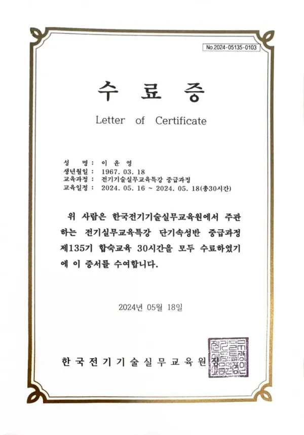 전기실무교육 / 심화교육 수료증 페이지 정보 작성자 다온라인 댓글 댓글 0건 조회Hit 30회 작성일Date 26-01-18 14:44 본문 전기실무심화교육 수료증 목록 글쓰기 이전글건축목공기능사 자격증 26.01.18 댓글 0 댓글목록 등록된 댓글이 없습니다.