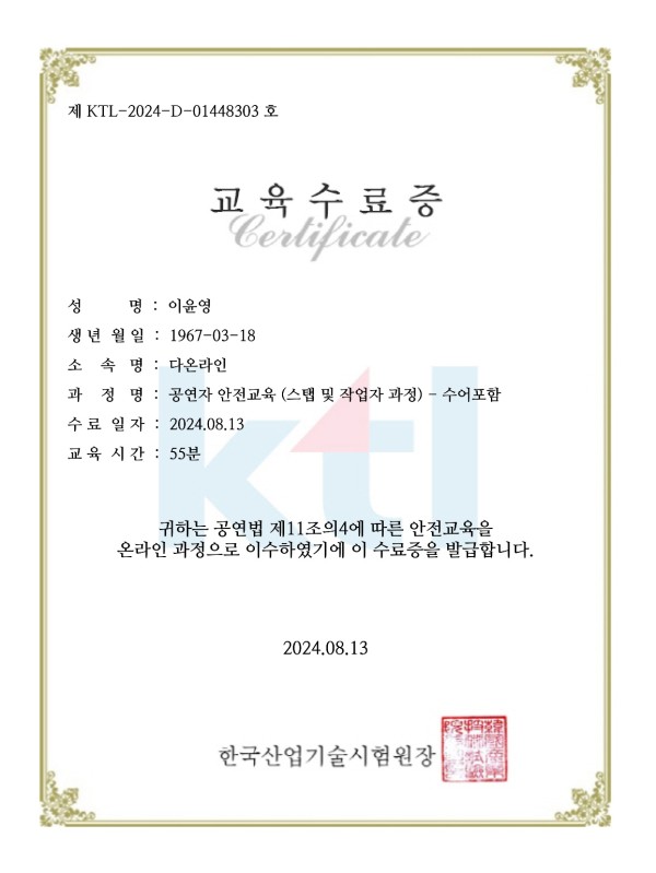 공연자 안전교육 수료증 페이지 정보 작성자 다온라인 댓글 댓글 0건 조회Hit 29회 작성일Date 26-01-19 14:26 본문 공연무대, 졸업작품 전시장을 제작하기 위한 안전교육수료장 입니다. 목록 글쓰기 다음글인테리어공사 표준계약서 26.01.18 댓글 0 댓글목록 등록된 댓글이 없습니다.