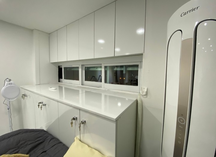 창문을 부분적으로 수납장으로 가려서 프라이빗한 느낌도 주고 수납 공간을 획기적으로 늘려서 각종 기구나 재료들을 모두 수납장에 넣을 수 있도록 해서 전체적으로 깔끔하게 느낄 수 있도록 했습니다.