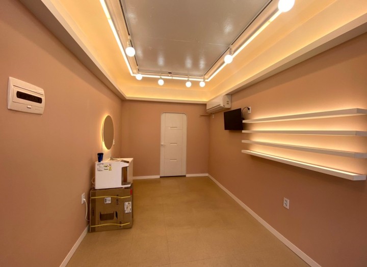 총 공사비 600만원, 3면 가벽설치, 오픈천장 레일조명 및 간접조명, 데코타일 바닥마감. 초저가 공사 소규모 네일샵
